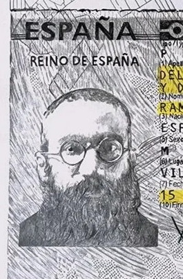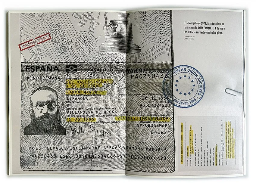 Este trabajo nace de un encargo del Ministerio de Memoria Democrática, del Gobierno de España, para un libro conmemorativo de los cincuenta años de democracia. Mi pieza debía abrir el capítulo dedicado al ingreso del país en la Comunidad Europea. Lo que se esperaba era, quizá, una celebración del viaje colectivo hacia la modernidad; lo que propuse fue un documento de identidad imposible: un pasaporte expedido a nombre del incorregible escritor gallego Ramón María del Valle-Inclán, cuya actitud vital —desobediente, lúcida y profundamente española— siempre he considerado una forma de resistencia estética.